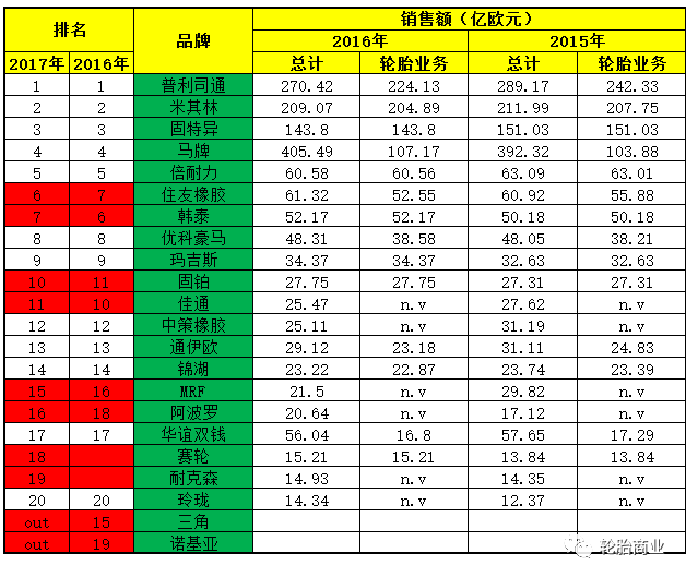 有12家轮胎企业连结不变。前五名只要马牌实现了增加。